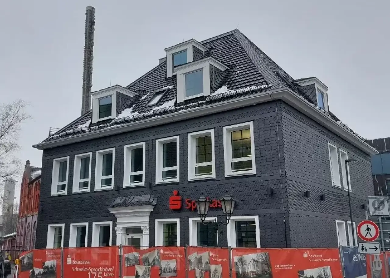 Das alte, regionaltypisch schieferverkleidete Wohn- und Geschäftshaus am Bürgerplatz in Schwelm, der Kreisstadt des Ennepe-Ruhr-Kreises nordöstlich von Wuppertal, wird im Volksmund „Patrizierhaus“ genannt. Es war um das Jahr 1700 errichtet worden und diente der benachbarten Privatbrauerei von 1830 bis 2011 als Verwaltungsgebäude. 2018 erwarb die Städtische Sparkasse das Gebäude, um dort die Firmenkundenberatung und das Private Banking unterzubringen. Ein Gutachter stellte allerdings so große Mängel an der Bausubstanz fest, dass eine Sanierung des Denkmals nicht möglich war. Es blieb nur der Abriss, der das Stadtbild am Bürgerplatz zerstört hätte. So beschloss die Sparkasse, das „Alte Patrizierhaus“ durch ein „Neues Patrizierhaus“ zu ersetzen und den vertrauten Anblick wiederherzustellen. Auch beim Walmdach orientierte man sich – von den Gauben abgesehen – in Absprache mit der Denkmalpflege am alten Dachbild im bergisch-barocken Stil. Die Eindeckung von First, Graten und Gauben erfolgte mit Schiefer, die Dachfläche mit ähnlichen Tondachziegeln.