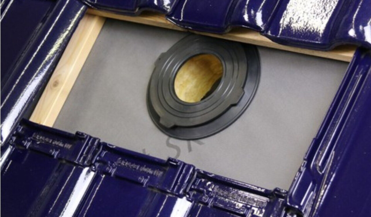 Für Durchdringungen mit den Rohrdurchmessern DN 110, DN 125, DN 160 und DN 180 bietet sich eine raffinierte Lösung an: der universell einsetzbare Dichtring für regensichere Anschlüsse an die Unterspann-/Unterdeckbahn. Er ist ab einer Mindestdachneigung von 5° einsetzbar (unter Beachtung der Regeldachneigung des jeweiligen Bedachungsmaterials). Der Grundring besteht aus PP, der Klappring aus TPE-und die Manschette aus EPDM. Dank dieser hochwertigen PP/TPE/EPDM Materialkombination ist der Dichtring UV-beständig, außerdem – beim Einsatz unter der Eindeckung – frost-, alterungs- und temperaturbeständig.