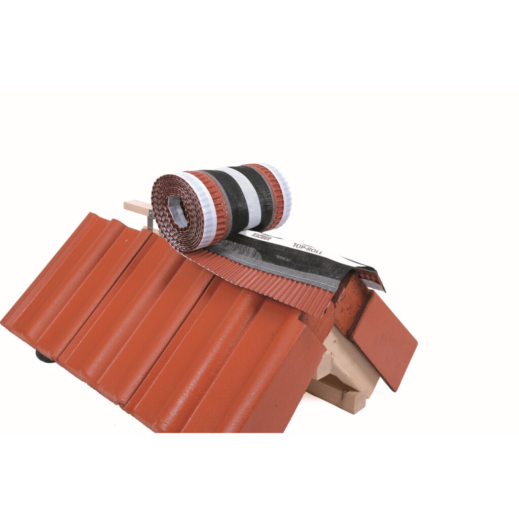 Die Gittergeweberolle Top-Roll zeichnet sich besonders durch hohe Lüftungseigenschaften aus. Aufgrund der Breitenvielfalt von 210 mm, 310 mm und 390 mm in Verbindung mit einer Dehnreserve von 30% im Seitenstreifen ist die Rolle flexibel für flach bis stark profilierte Dachsteine bzw. Dachziegel geeignet. Der AluminiumSeitenstreifen ist mit dem Mittelteil verklebt und zusätzlich vernäht, sodass die Rolle eine sehr hohe Reißfestigkeit hat. Die robuste Gittergewebestruktur schützt den First- bzw. Gratbereich vor Schnee- und Regeneintrieb. Das Nagelband sorgt für eine optimale Ausrichtung auf der Firstlatte und vereinfacht die Verlegung.