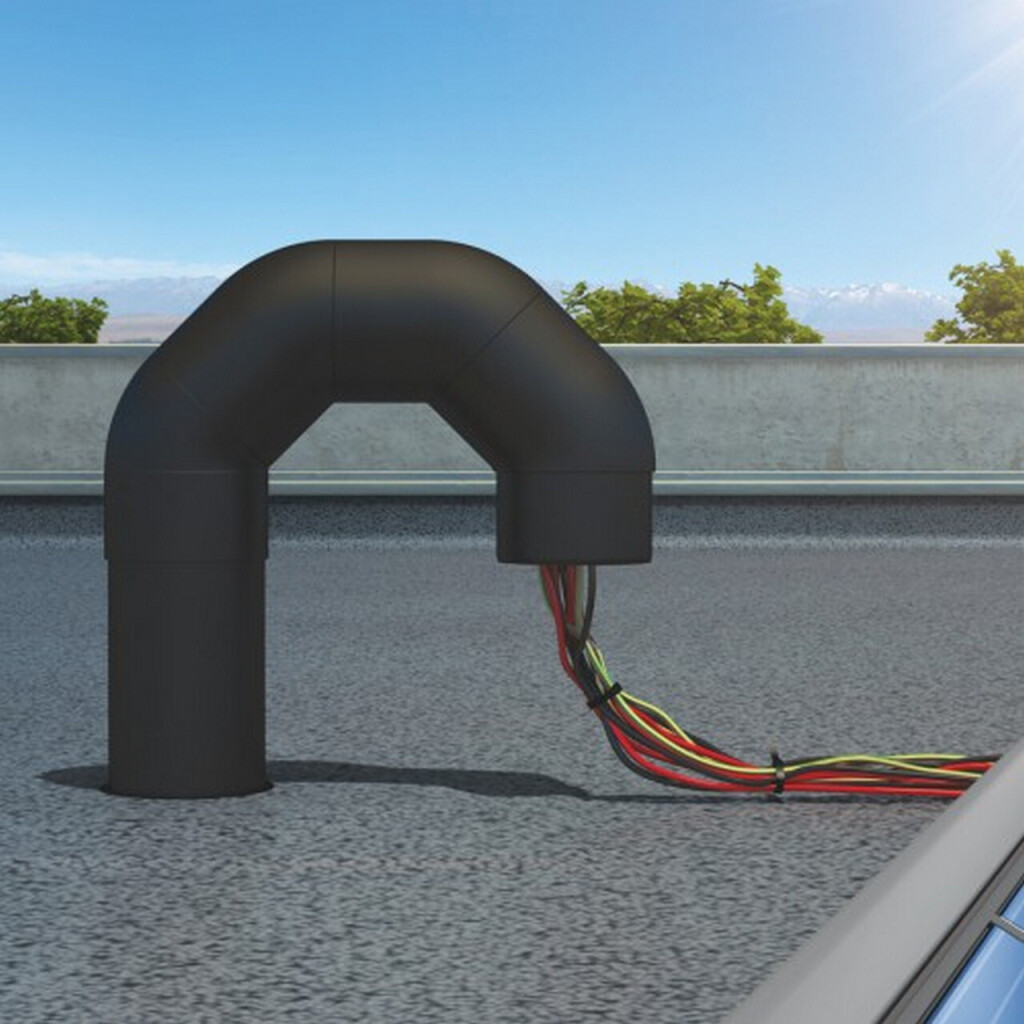 Mit dem Flavent Rohrbogen-Set sind Dachdurchführungen (z.B. Durchführung von Energieleitungen) einfach zu installieren. Das Rohrbogen-Set kann individuell mit den ungedämmten Flavent Lüfterelementen kombiniert werden. Einfach die Regenhaube abnehmen oder abtrennen und durch das Rohrbogen-Set ersetzen. Ein Set besteht aus vier einzelnen 45° Rohrbögen, die Bögen sind mit Tangit Verbundklebstoff Kleber zu verkleben. Ergänzende EPDM Stufenmanschetten, passend zu den Oberrohr-Nennweiten der Lüfterelemente, gewährleisten eine Abdichtung der Leitungsdurchführung.