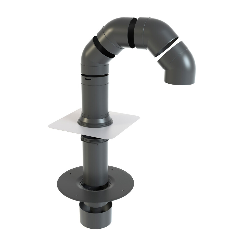 Mit dem Flavent Pro Rohrbogen-Set sind Dachdurchführungen (z.B. Durchführung von Energieleitungen) einfach zu installieren. Das Rohrbogen-Set kann individuell mit den Flavent Pro Lüfterelementen kombiniert werden. Einfach die Regenhaube abnehmen und durch das Rohrbogen-Set ersetzen. Ein Set besteht aus vier einzelnen 45° Rohrbögen, die Bögen sind mit Tangit Verbundklebstoff Kleber zu verkleben. Ergänzende EPDM Stufenmanschetten, passend zu den Oberrohr-Nennweiten der Lüfterelemente, gewährleisten eine Abdichtung der Leitungsdurchführung.
