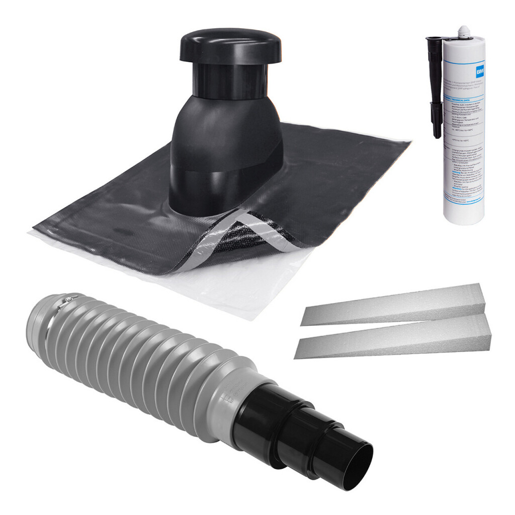Das Set beinhaltet die Universal Lüfterhaube inkl. Dicht- und Montagekleber und Profilfüllern sowie einen hochwertigen Weich-PVC Flex-Anschlussschlauch zum Anschluss an DN 110/90/75. Geeignet sowohl zur Strangentlüftung bzw. Raum Be-/Entlüftung auf Metalldachprofilen. Das Lüfterrohr ist aus verzinktem Stahl und wärmegedämmt. Aufgrund der selbstklebenden Manschette kann die Durchführung schnell und ohne Spezialwerkzeug mit der Metalloberfläche verklebt werden, eine zusätzliche mechanische Verschraubung ist nicht notwendig. Die flexible Manschette ermöglicht den Einsatz auf verschiedenen Metalldachprofilen (z.B. Trapez- oder Sandwichprofile).